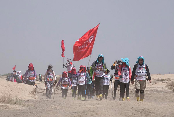 5月22日,参赛选手徒步穿越戈壁。当日,来自国内外57所院校商学院的2500多名EMBA及MBA学员,齐聚甘肃省瓜州县参加第十二届玄奘之路商学院戈壁挑战赛。比赛路段设在瓜州县境内莫贺延碛戈壁,参赛选手将利用四天三夜时间,穿越砾石戈壁、盐碱地、砂石路、柏油路、软戈壁等地貌,夜晚野外露营,最终完成总长约117公里的比赛。